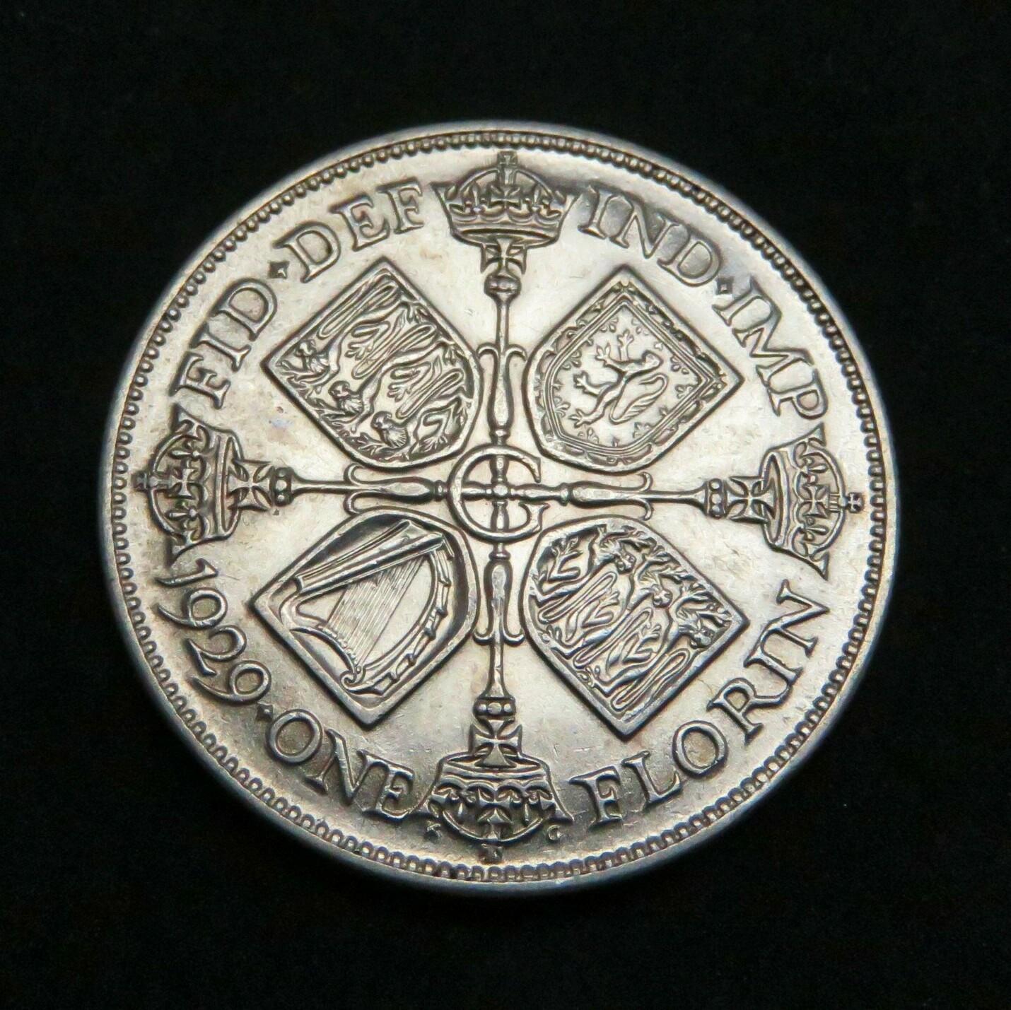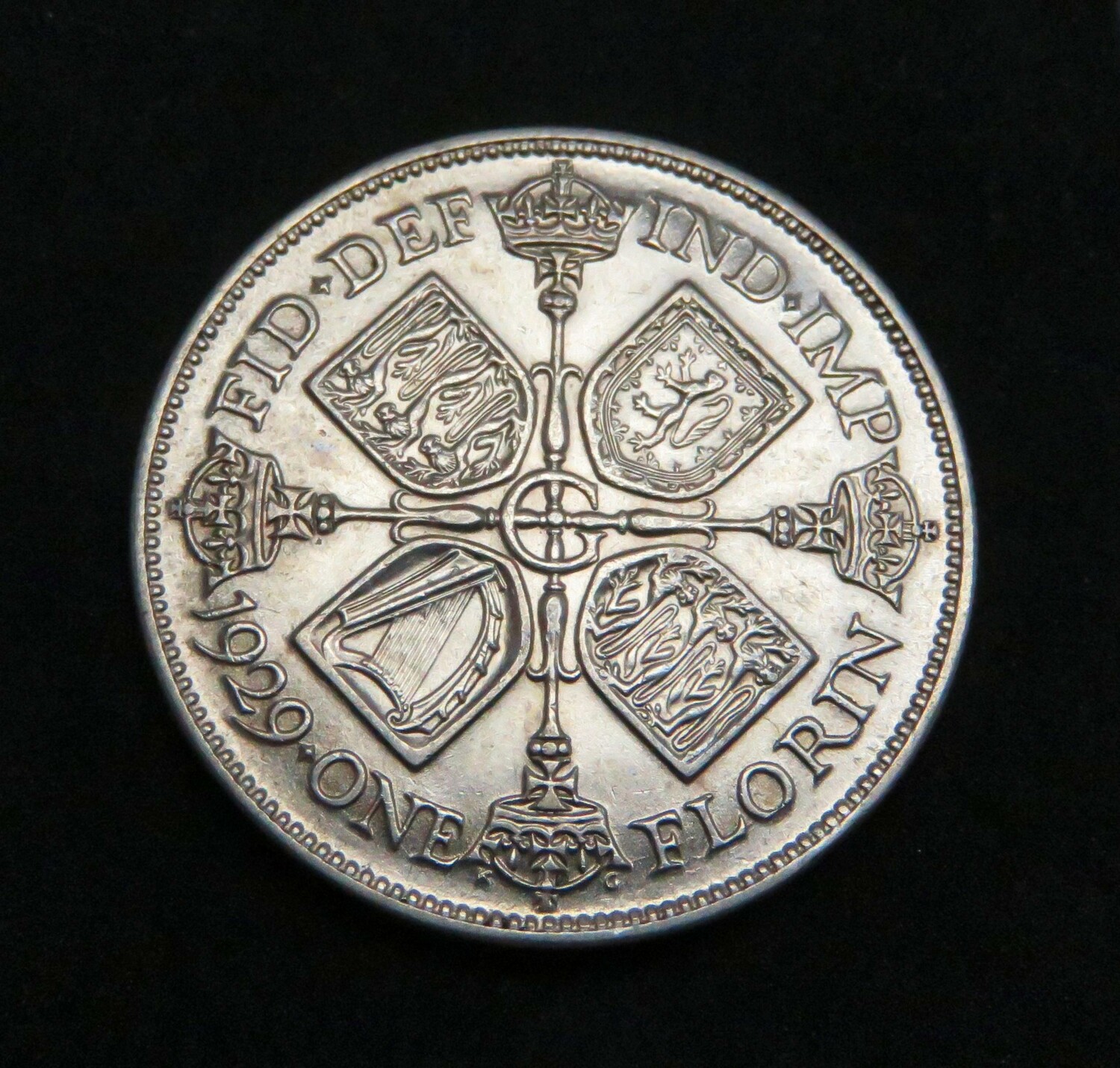 Реверс: Гербы Англии два раза), Шотландии и Ирландии, скипетры с коронами. Надпись вверху FID·DEF IND·IMP = Defender of the Faith Emperor of India = Защитник веры, император Индии. Надпись снизу: номинал и год = 1929 ONE·FLORINE·